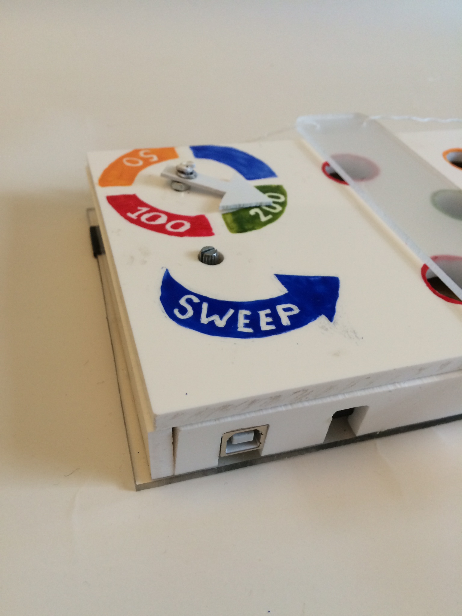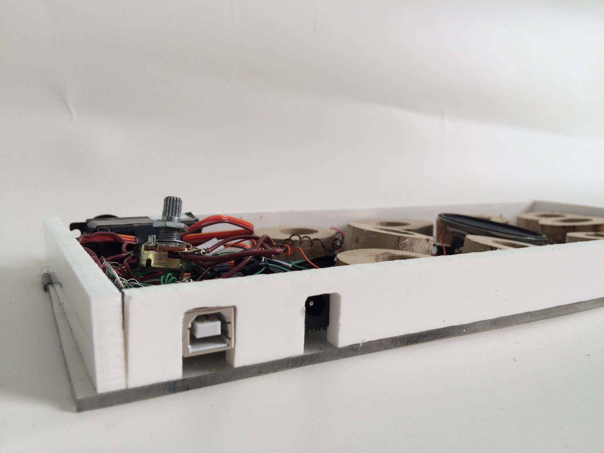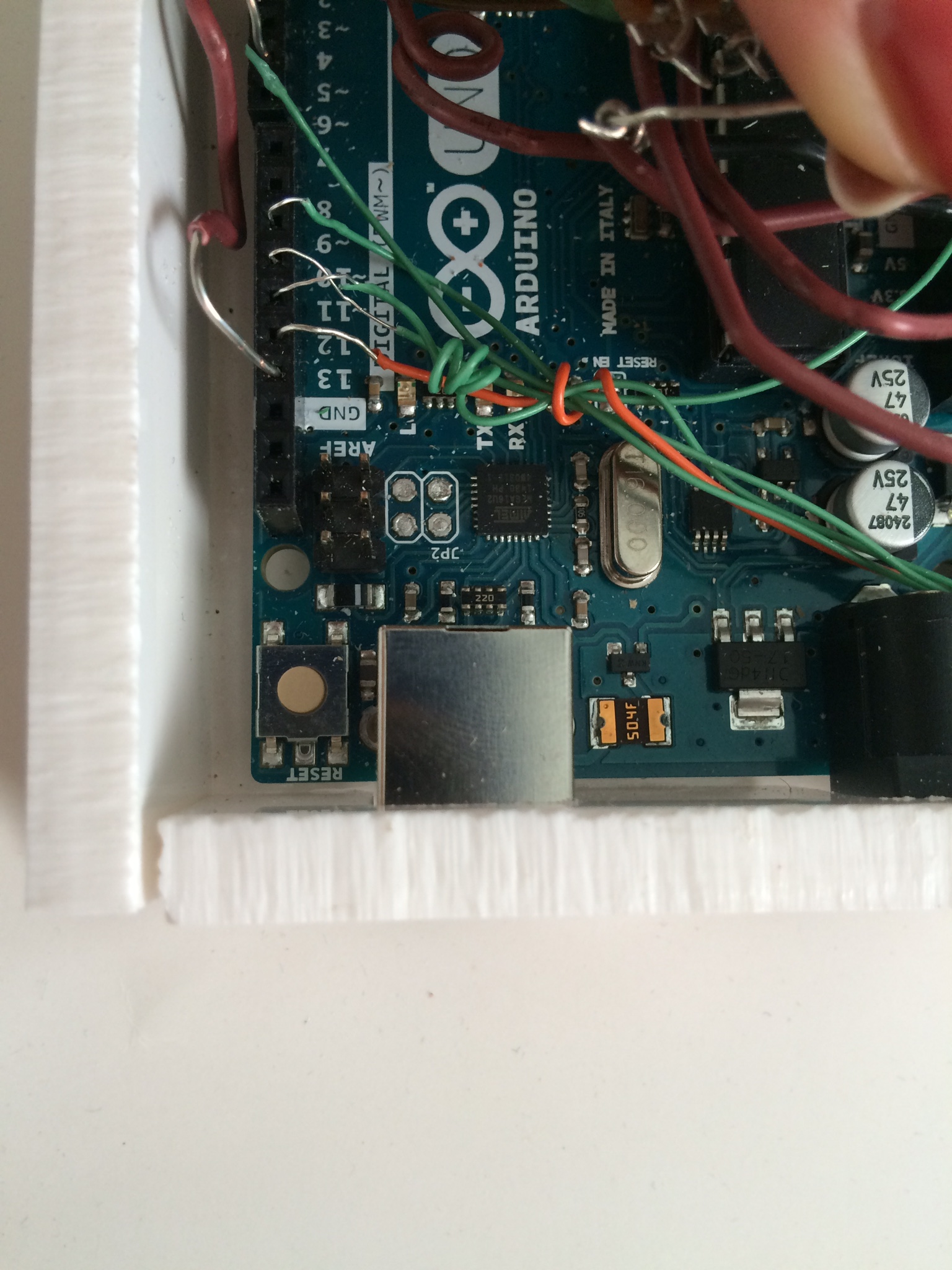 All the holes and shapes are custom fitting to the components such as Arduino plug, potentiometer and servo arms.