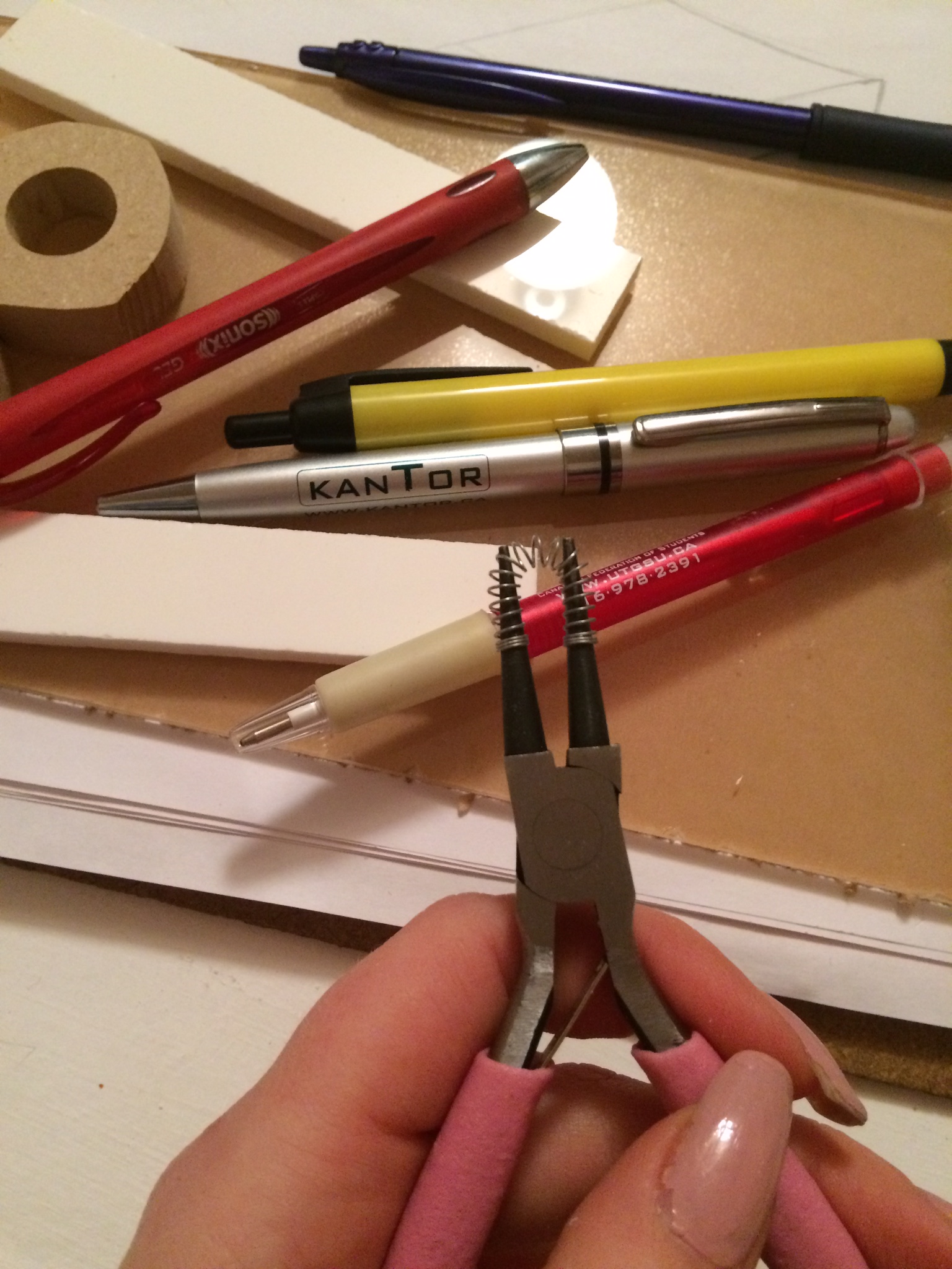 The pod holder made up of black foam, a spring, a wire connected to ground and a resistor (connecting to a pin). I added solder to make the wires protrude more.