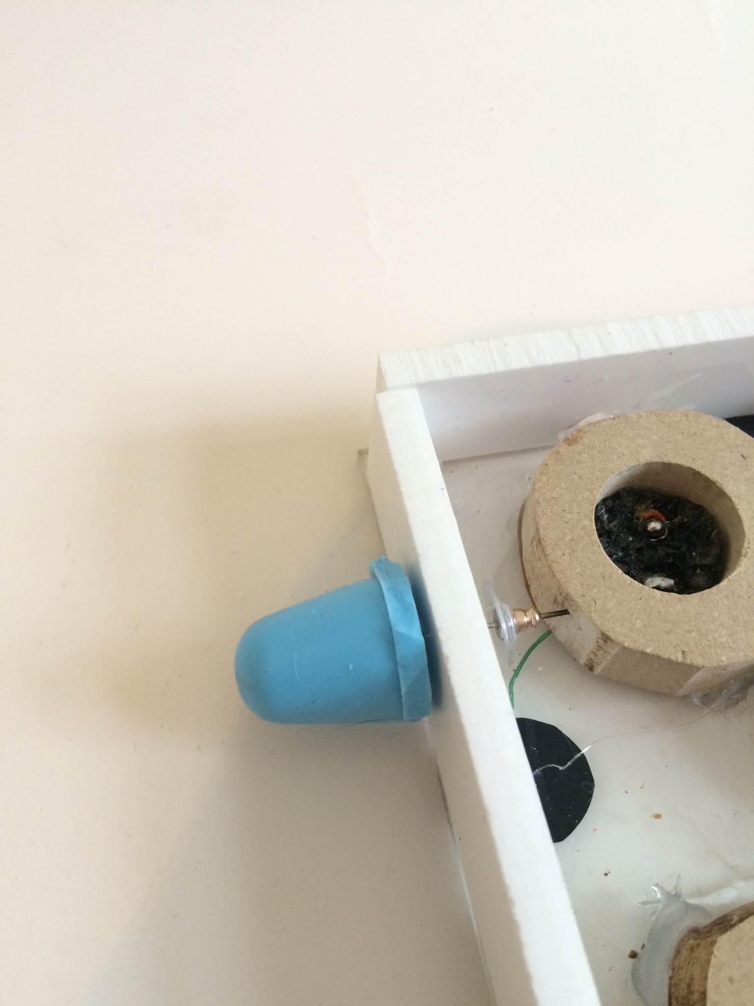 The servo arm, inspired by the "507 Mechanical Movements" book I used a belt to make the arm slide across the game, one side of the belt is attached at the servo and the other side is a rotating end, it is a blue silicone nub (to create friction) attached to a simple sewing needle and earring backing to keep it in but allow it to rotate